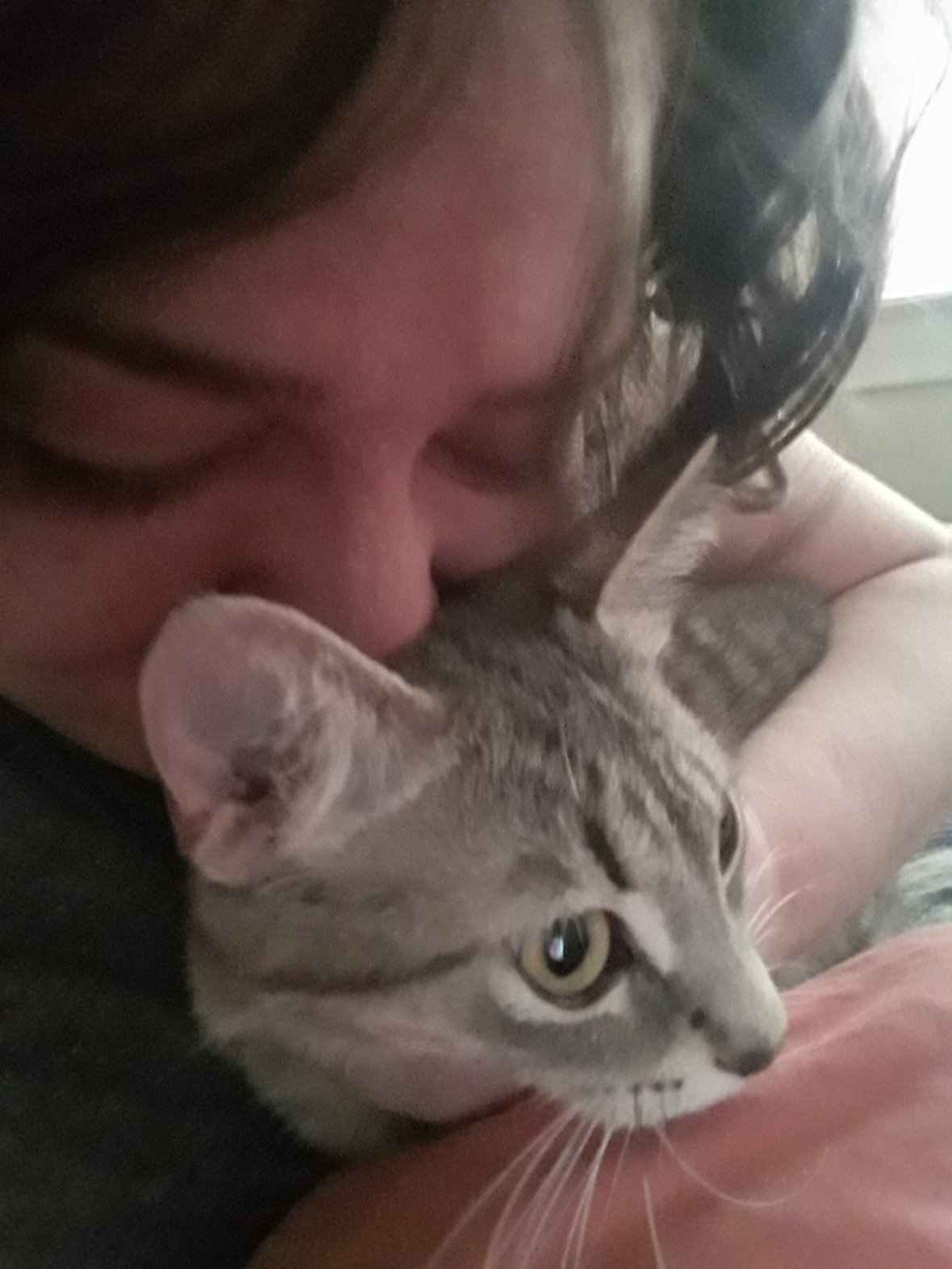 My husband brought her to me as I sat in the car anxiously waiting to meet her. He handed her to me through the window and I wrapped her up in a small blanket on my lap, holding her tight so she knew she was safe, she purred as if she knew she was ours. When we got her home she was treated for the fleas, worms and bathed. She didnt know how to use the litterbox but box trained quickly and now has no bad habits at all.